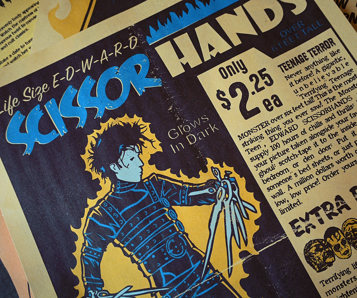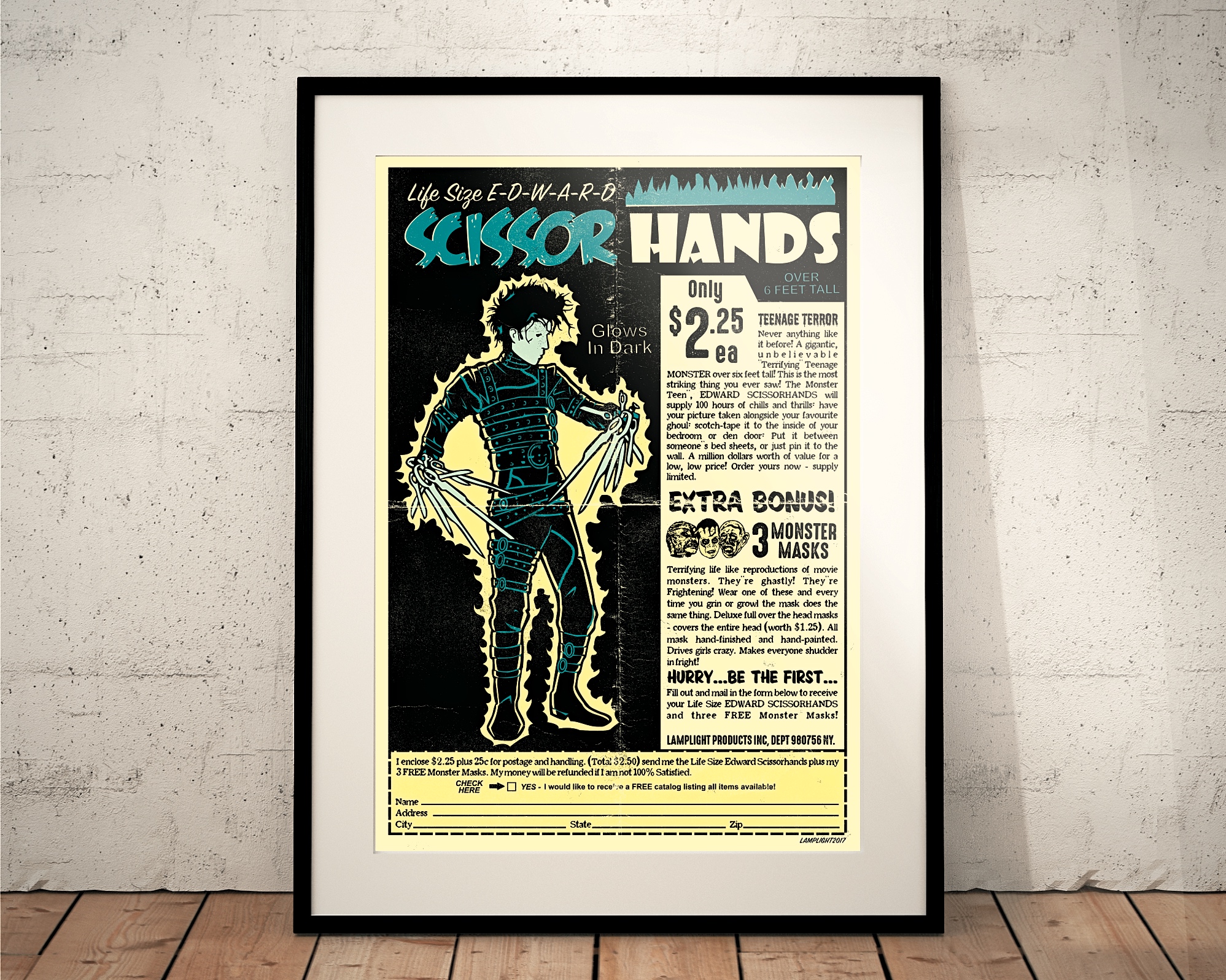 Vintage store ad inspired Edward Scissorhands (Movie) themed Print. ***Four Colour Design on Cold Pressed 180gsm Paper / Limited Run / All prints are signed and numbered*** Available in Size: A2 (16.53 x 23.39 inch / 42 x 59.4 cm), A3 (11.7 x 16.5 inch / 29.7 x 42.0cm) and A4 (8.27 x 11.69inch / 21 x 29.7cm).