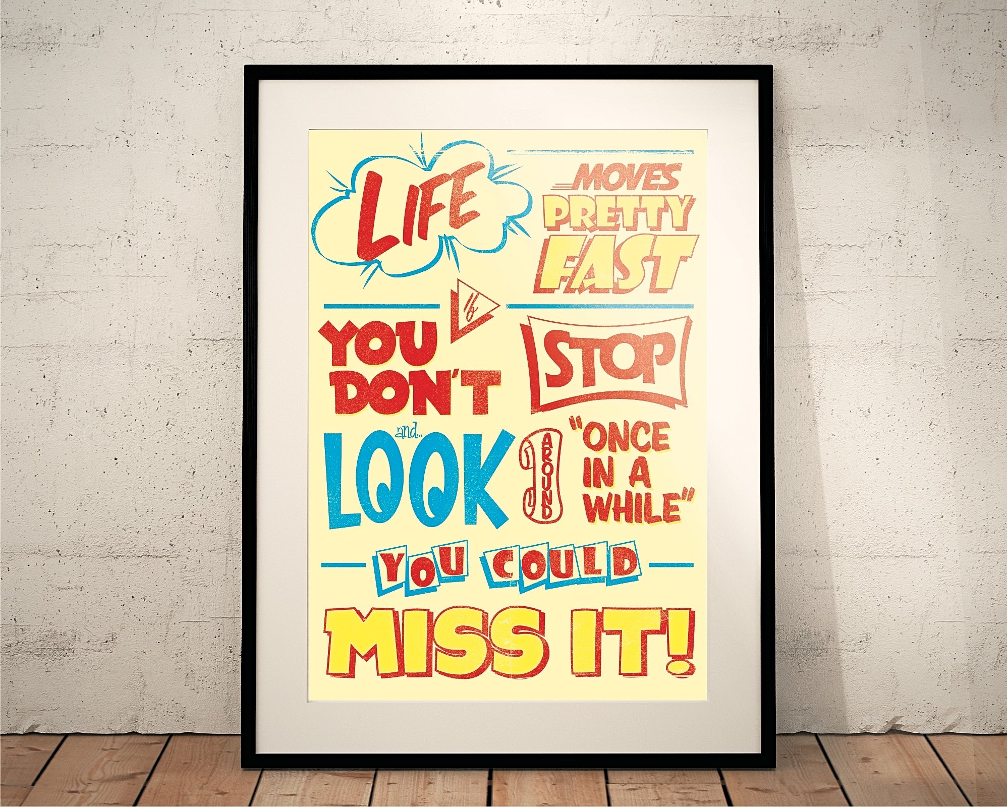 Printed and Cut by Hand in Uttoxeter, England this poster features our Vintage store ad' inspired 'Ferris Bueller's Day Off' themed poster featuring the classic movie quote "Life movies pretty fast. If you don't stop and look around once in a while, you could miss it".