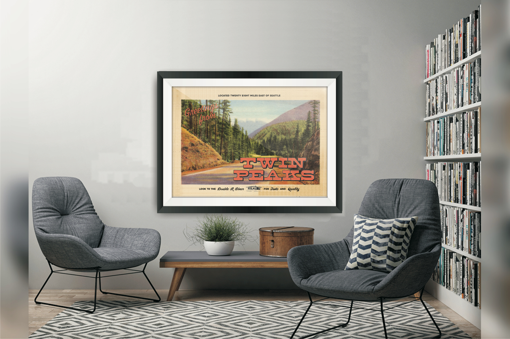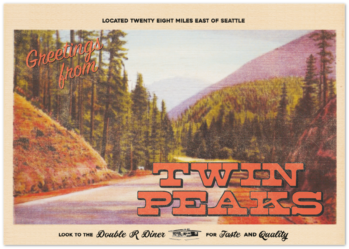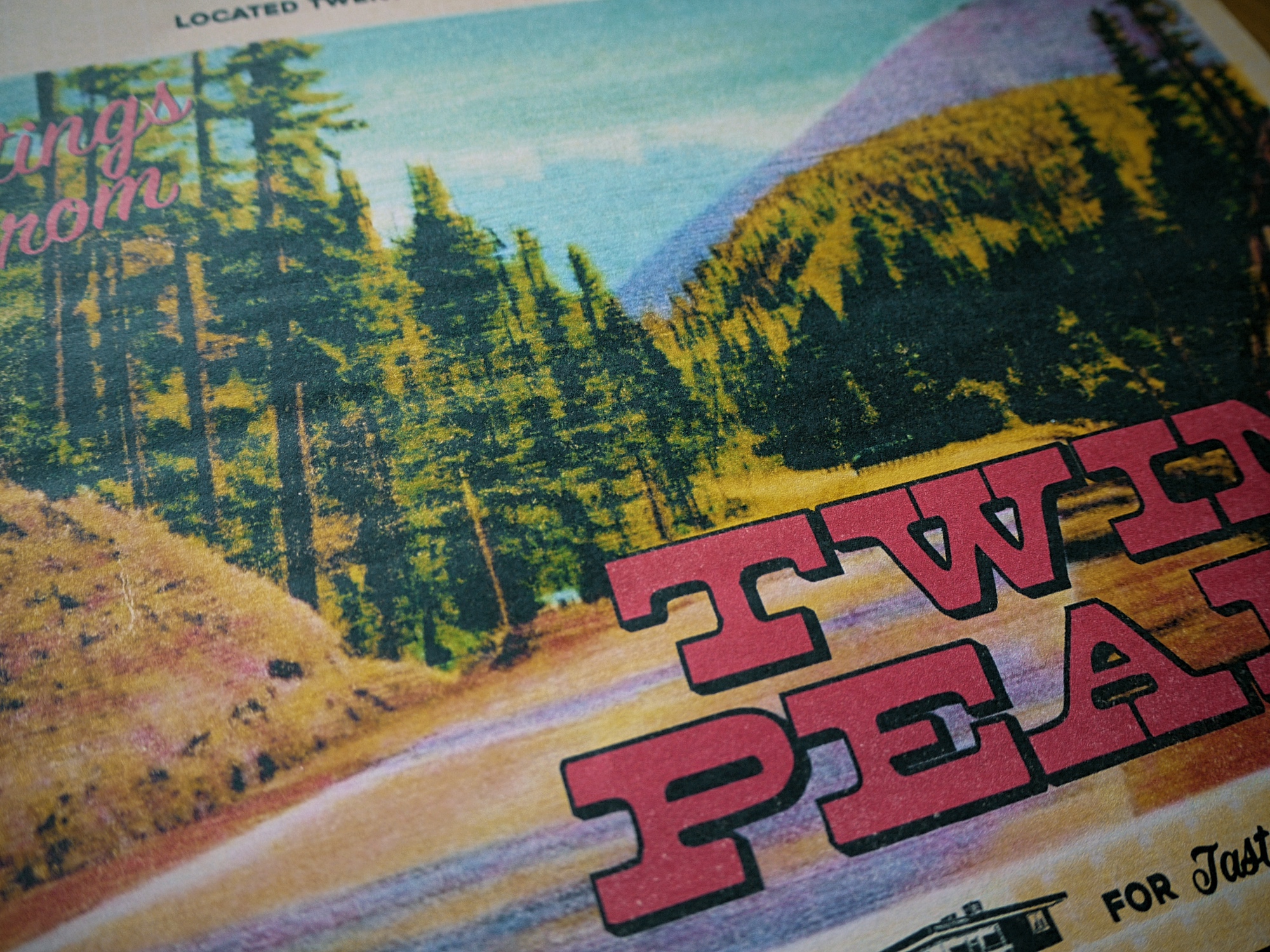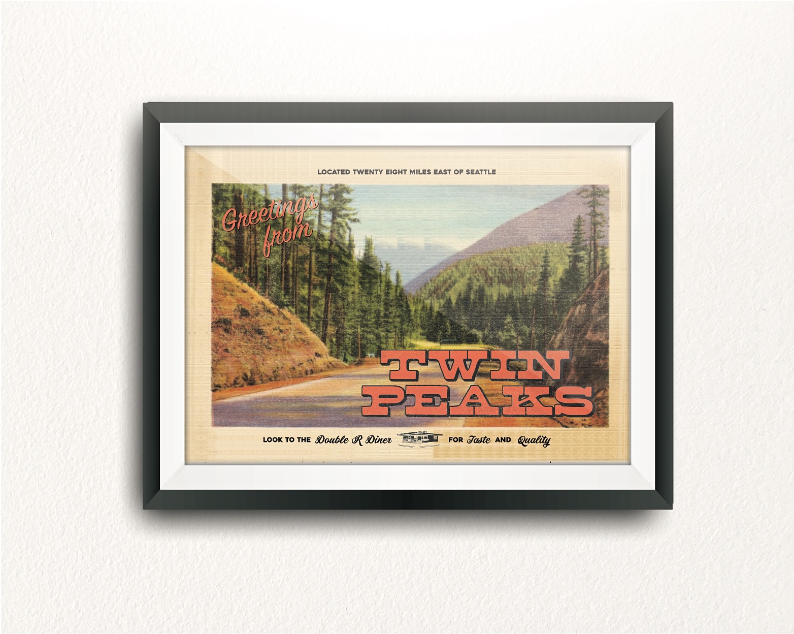 Printed and Cut by Hand in Uttoxeter, England this poster features our vintage postcard inspired 'Twin Peaks' themed poster.