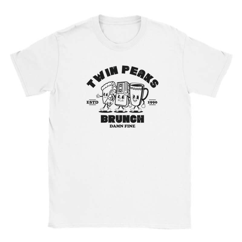 Available in two colours, this shirt features a vintage 1930s cartoon inspired design. Image features three of the iconic props; a slice of Double R cherry pie, Agent Cooper's dictaphone and a 'Damn Fine Cup of Coffee', all strutting their stuff.